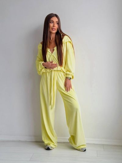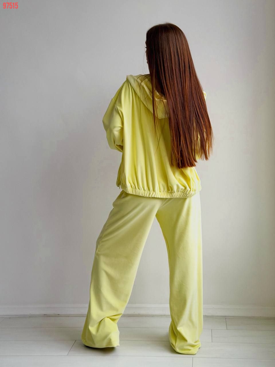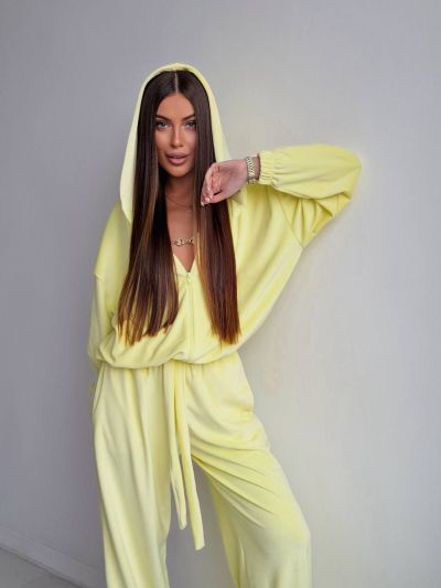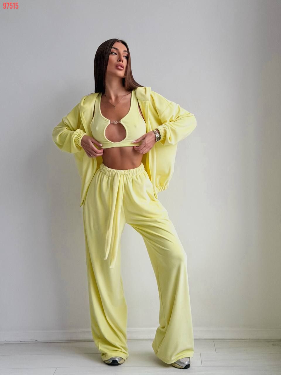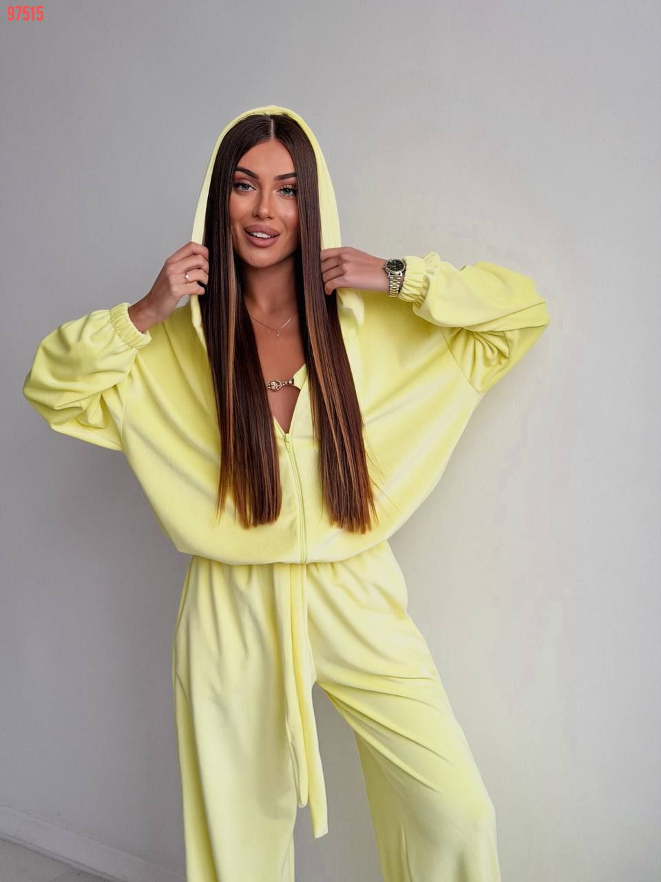 Костюм із м’якого велюру – ідеальний вибір для тих, хто любить комфорт і водночас виглядає розкішно Вільний крій штанів із зав’язкою на талії, топ з фурнітурою, і подовжена кофта на резинці, подвійний капюшон Підходить і для прогулянок, і для стильних домашніх днів, і навіть для подорожей